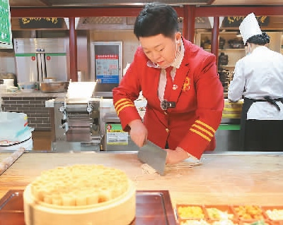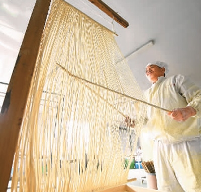 制作一份宮面需要20多個小時,包括和面、醒面、盤條等13道工序。其中,醒面需要多次進(jìn)行,讓面粉吸足水分變得膨脹,面粉顆粒彼此緊抱,這也是宮面彈性十足、口感筋道的秘密所在。