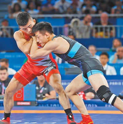當(dāng)?shù)貢r(shí)間8月6日,中國隊(duì)選手曹利國(右)在巴黎奧運(yùn)會(huì)男子古典式摔跤60公斤級(jí)決賽中。環(huán)球時(shí)報(bào)記者 李 昊攝