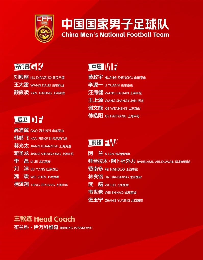 以下為24人大名單:武磊、顏駿凌、蔣光太、魏震(上海海港),王大雷、劉洋、高準翼、黃政宇、謝文能、李源一(山東泰山),韋世豪(成都蓉城),費南多、蔣圣龍、徐皓陽、楊澤翔、汪海健(上海申花),李磊、張玉寧、林良銘(北京國安),劉殿座(武漢三鎮(zhèn)),韓鵬飛(天津津門虎),王上源(河南),拜合拉木·阿卜杜外力(深圳新鵬城),阿蘭(青島西海岸)。
