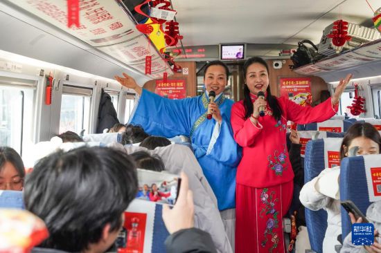 春運前夕,中國鐵路上海局集團有限公司合肥客運段組織由鐵路職工組成的非遺表演小分隊登上C3685次旅客列車,為車廂內的旅客帶來“廬州蛋雕”和黃梅戲表演等,并為旅客送上祝福。