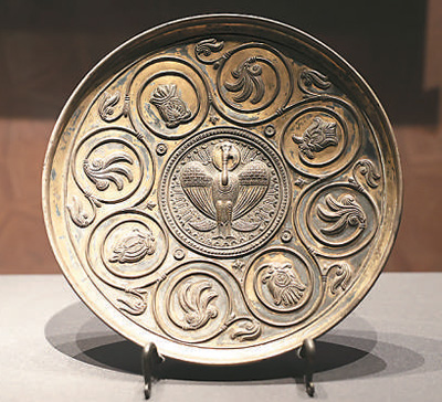獅子在伊朗文化中有著獨(dú)特的含義,被視作密特拉的化身。在瑣羅亞斯德教成為正統(tǒng)后,獅子進(jìn)一步成為波斯帝王權(quán)力的象征。展出文物中常見獅子形象,如阿契美尼德王朝的大理石獅子首、青銅獅形御座腿,薩珊王朝(公元3—7世紀(jì))的嵌金獅紋銀盤、青金石人首獅首紋黃金項(xiàng)圈等。嵌金獅紋銀盤采用了薩珊金銀器常用的火法鍍金工藝,盤中央的大圓形框內(nèi)為獅子圖案,周圍6個(gè)小圓形框內(nèi)飾有幾種動(dòng)物圖案,包括鹿與公羊等。黃金項(xiàng)圈上裝飾著3顆碩大的青金石,左右兩顆為圓形,飾有獅頭,中間的一顆為橢圓形,雕刻著人物頭像,專家推測為薩珊國王的形象。