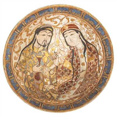 米納伊彩人物花卉銘文釉陶碗為核心展品之一。它產(chǎn)于公元12—13世紀(jì),內(nèi)壁中央繪有一對(duì)戀人,這是古代伊朗常見的藝術(shù)插圖題材。這對(duì)戀人的形象具有明顯的東亞人特征,男子手中握著一個(gè)精致的酒杯,似乎在向他的愛人敬酒。人物周圍環(huán)繞著平行和扭曲的阿拉伯式花紋,碗口在一圈鈷藍(lán)底上飾有金色庫法體文字。