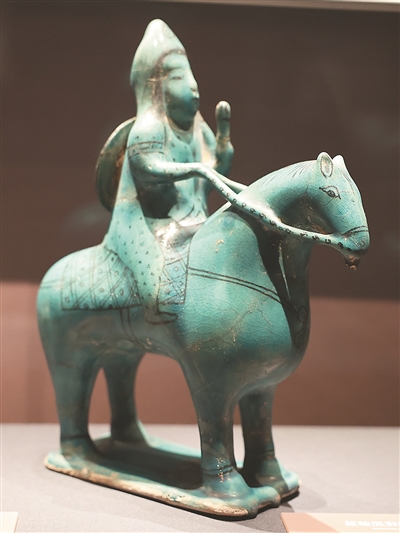 綠松石色釉小型樂隊(duì)模型為公元12—13世紀(jì)的作品,其結(jié)構(gòu)呈方形,表現(xiàn)了樂隊(duì)演奏或宴會(huì)場景,11名樂手分別演奏鐃鈸、鼓、琴、長笛等樂器,場地中央置一果盤。藍(lán)釉黑彩騎士陶塑刻畫了具有東亞特征面孔的騎士形象。騎士頭戴尖頂帽,背負(fù)盾牌,其造型受到中國藝術(shù)的影響。