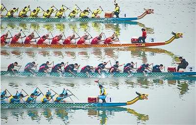 “比賽項(xiàng)目很豐富,有200米、500米直道賽以及搶紅奪標(biāo)賽,今年還新設(shè)了龍舟拔河。”郭坤說,傳統(tǒng)的龍舟一般坐22個(gè)人,現(xiàn)在比賽用的小龍舟通常坐12個(gè)人。