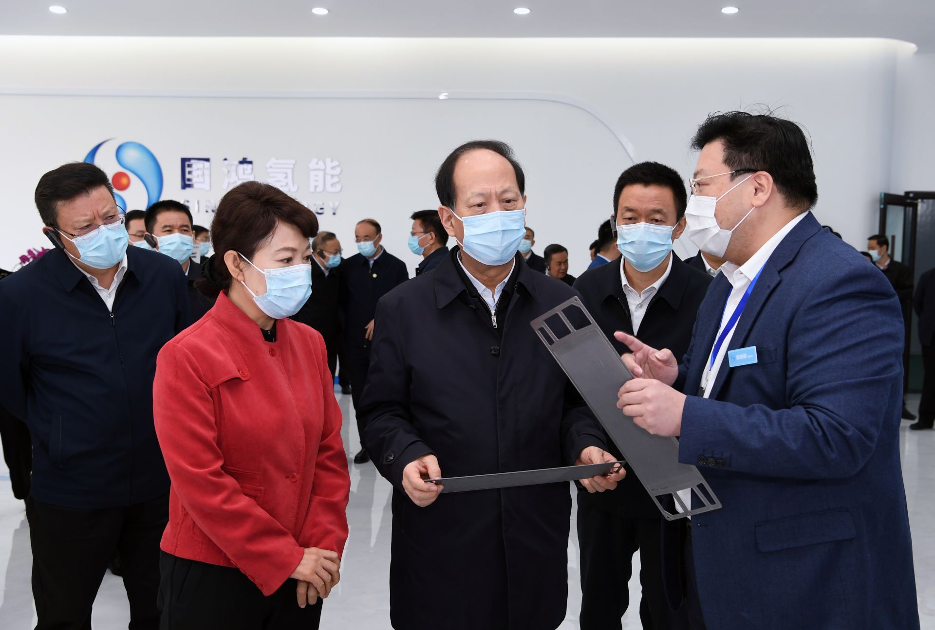 4月8日,自治區(qū)黨委書記、人大常委會(huì)主任石泰峰,自治區(qū)黨委副書記、自治區(qū)主席王莉霞,與參加自治區(qū)推進(jìn)高質(zhì)量發(fā)展重大項(xiàng)目建設(shè)動(dòng)員大會(huì)代表一起觀摩國(guó)鴻氫能科技有限公司鴻氫能商用車動(dòng)力系統(tǒng)集成生產(chǎn)項(xiàng)目。內(nèi)蒙古日?qǐng)?bào)社融媒體記者 袁永紅 攝