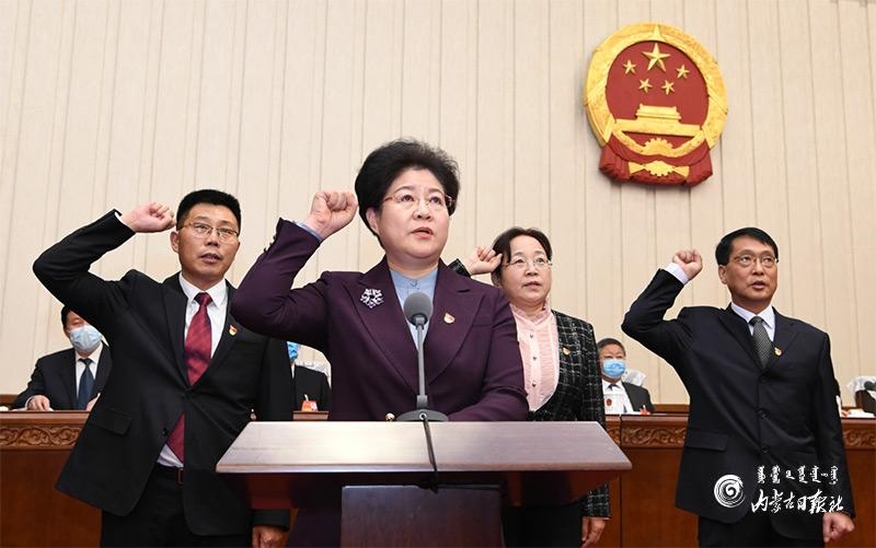 1月20日上午,自治區(qū)十三屆人大常委會(huì)第二十四次會(huì)議舉行了憲法宣誓儀式。自治區(qū)黨委書記、人大常委會(huì)主任石泰峰主持并監(jiān)誓。圖為新任職人員在依法進(jìn)行憲法宣誓。內(nèi)蒙古日?qǐng)?bào)記者 袁永紅 攝