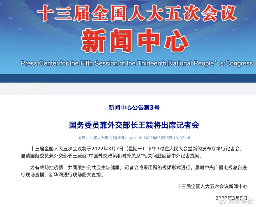 十三屆全國人大五次會議將于3月7日(星期一)下午3時在人民大會堂新聞發(fā)布廳舉行記者會,邀請國務(wù)委員兼外交部長王毅就“中國外交政策和對外關(guān)系”相關(guān)問題回答中外記者提問。