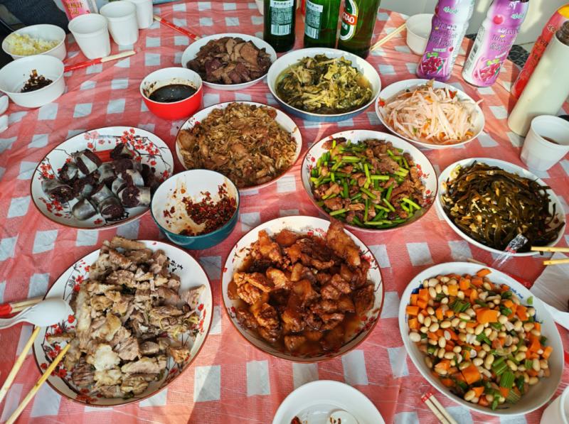 忙活了一上午,紅白相間的桌布上各類菜品早已擺得滿滿當(dāng)當(dāng),除了位居主位的殺豬菜,還多了許多“衍生作品”:醬燜肉、汆白肉、蒜苔炒肉、酸菜炒肉、涼拌豬肝、豬血腸、涼拌海帶條、芥菜絲……圍坐一圈的不止家人,還有左鄰右舍。無(wú)需主人過(guò)多招呼,筷子便紛紛探向鍋中。窗外寒風(fēng)漸歇,霧氣也被陽(yáng)光驅(qū)散,而在溫暖的屋子里,鍋氣蒸騰,模糊了窗上的冰花,也潤(rùn)濕了每一雙帶著笑意的眼睛。這不僅僅是一頓飯,更是鄉(xiāng)里鄉(xiāng)親們對(duì)生活最熱烈的擁抱?! ?/p>
