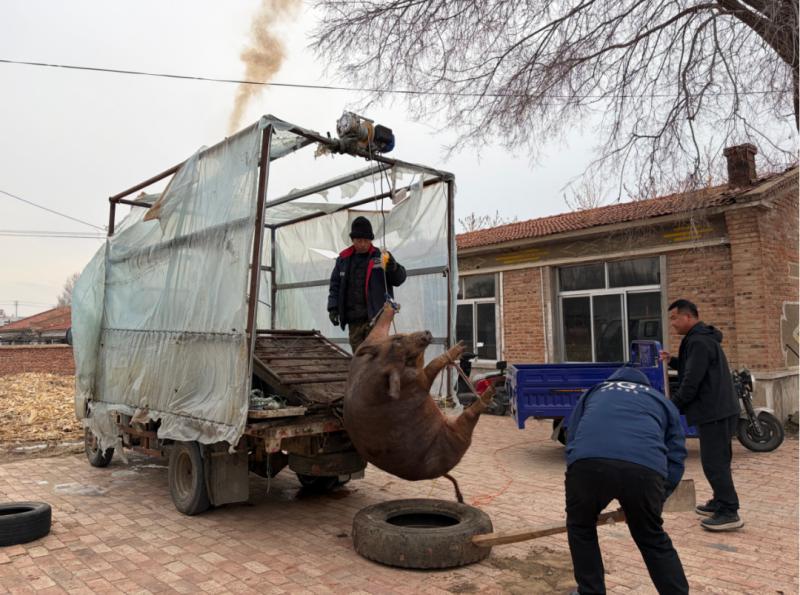 吃殺豬菜一向講求男女分工,家中的男子負(fù)責(zé)抓豬屠宰,女性們則負(fù)責(zé)后續(xù)的備菜烹煮工作。男人們穿上厚實(shí)的棉襖,呵著白氣走向豬圈,用早已準(zhǔn)備好的繩索,麻利地將豬的四肢捆扎結(jié)實(shí)。隨后,幾人合力將豬抬到宰豬的車上,王國(guó)春深吸一口氣,拿起殺豬刀,對(duì)準(zhǔn)豬的脖頸,動(dòng)作干脆利落。鮮紅的豬血順著事先準(zhǔn)備好的大盆緩緩流淌,不一會(huì)兒就接了滿滿一盆。殺完豬,男人們顧不上休息,就趕忙用滾燙的開水給豬褪毛,鐵刮子在豬身上來(lái)回刮擦,發(fā)出“唰唰”的聲響,不一會(huì)兒,原本黑乎乎的豬就變得白白凈凈。緊接著,他們立刻將豬開膛破肚,把內(nèi)臟分門別類地整理好,豬頭、豬蹄也被仔細(xì)地清洗干凈,準(zhǔn)備著后續(xù)的處理?! ?/p>