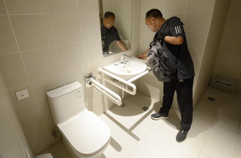 2021年7月15日,無障礙專家在北京延慶賽區(qū)冬奧村檢查室內(nèi)衛(wèi)生間無障礙設施。新華社記者 李欣 攝
